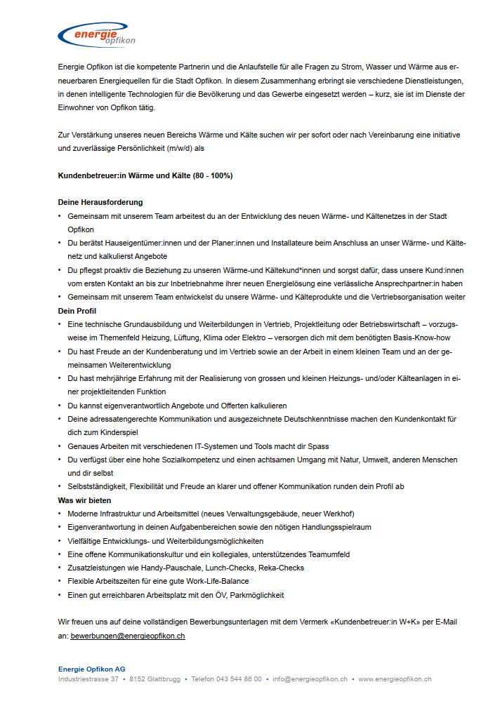 Download Stelleninserat Kundenbetreuer:in Wärme und Kälte (80-100%)