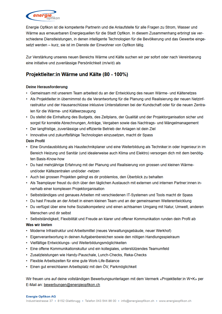 Download Stelleninserat Projektleiter:in Wärme und Kälte (80-100%)
